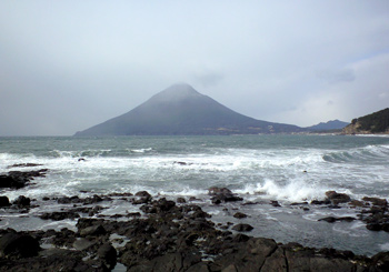 長崎鼻の下に降りた岩場から海越しの開聞岳。上のほうがうっすらと白いのがわかるでしょうか~?