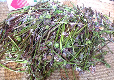画像は、獲ってきたばかりのゼンマイ。これから被っているワタを取って下ゆでして、それからお日様に干します。
