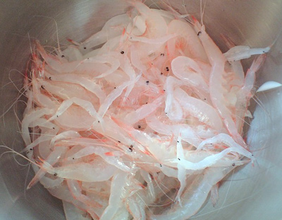 一匹づつ殻を剥いてお刺身でも食べられますが、剥くのが大変なので刺身としてスーパーに並んでいると少し高いです。でも甘くて美味しいんですよ~♪