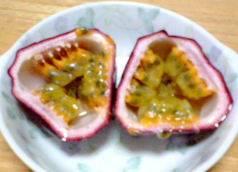 パッションフルーツも果物コーナーにあって、食しましたが、あちらは大きな種の周りに付いている果肉を種ごと食べる感じでした。果肉部分も少ないんですよね~。でも、果肉が潰れるときのあの酸味のあるジュース分と香りがたまりませんね~vv
