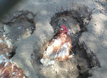 でも、中に植えられている笹竹の日陰に集まってました。やっぱあついんだよねぇ・・・。中には穴をガシガシと掘ってその中に身を潜めているニワトリも。掘ると少しは土が冷たいのですかね~、穴の中にぺたりと身をくっつけていたですよ~。