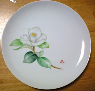 画像は出来上がった椿の絵柄のお皿です。かなり先生に修正していただいてますが、なんとか出来ました(汗)
